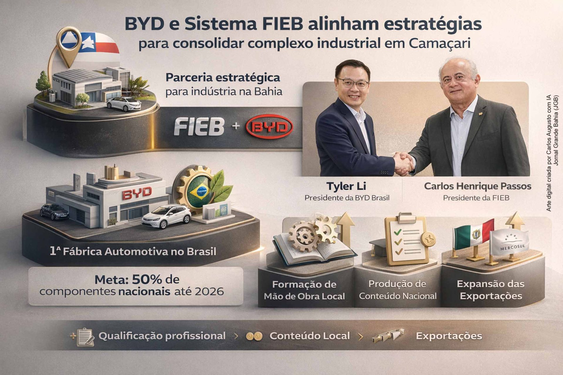 A parceria entre a BYD e o Sistema FIEB promete transformar Camaçari no coração da produção de veículos elétricos na América Latina. A iniciativa visa qualificar profissionais e aumentar o uso de componentes locais.