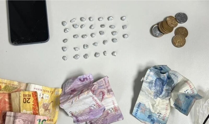 A situação foi o seguinte: quando o moço percebeu que a polícia tava chegando de mansinho, ele não teve jeito não, jogou um pacotinho plástico no chão, achando que ia passar batido. Mas num é que os soldados ficaram espertos? Na hora da abordagem, o camarada tava com R$ 74 no bolso e um celular na mão, que não é pouca coisa não, viu minha filha?